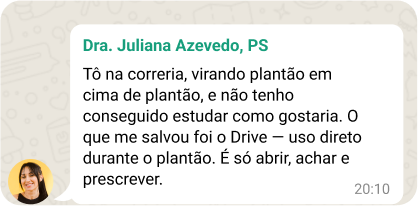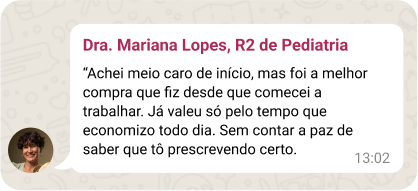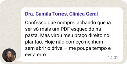 Mais de 14 milhões de pessoas já acompanham Camilla nas redes, e agora chegou a sua vez de ter nas mãos o que faltava no seu jaleco: prescrições prontas, baseadas na rotina real de PA e PS, com o olhar de quem já passou por isso.
